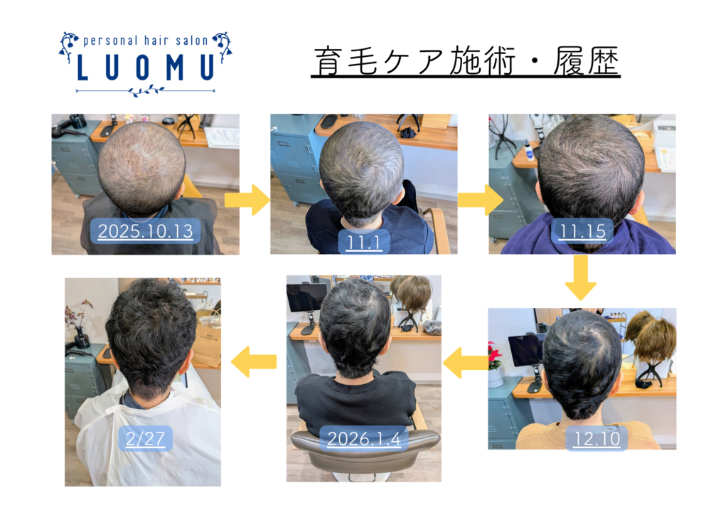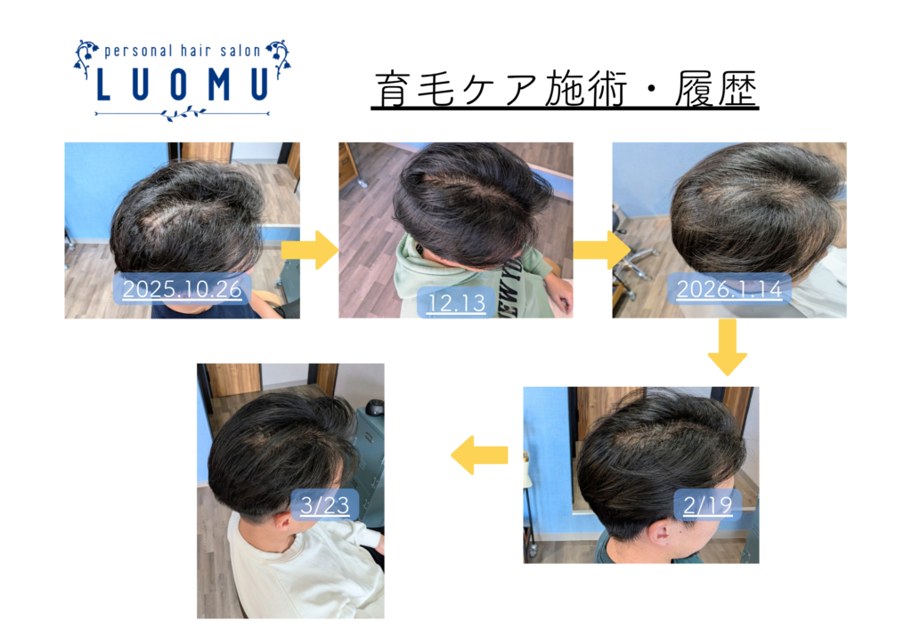 下→頭頂部や顔回りの毛量、抜け毛を気にされていた男性のお客様。髪の密度が少しずつ増え、髪も太くなっています。